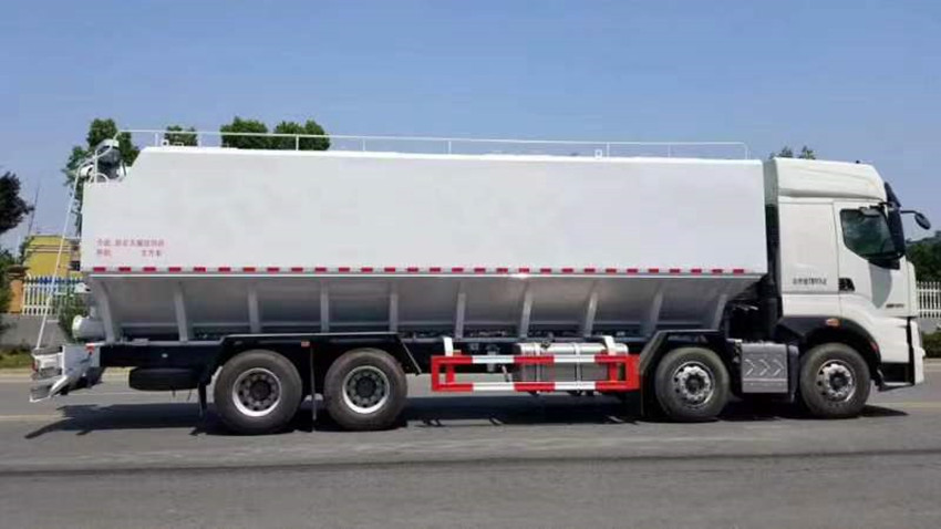 散裝飼料運(yùn)輸車,散裝飼料車的飼料罐架設(shè)在卡車的底盤上,罐頂開有進(jìn)料口.頂部的一根螺旋輸送卸料管(俗稱卸料絞龍)則可自由回轉(zhuǎn)和抬升,抬升的仰角可達(dá)60度。運(yùn)輸時(shí),頂部的螺旋管平臥在罐頂;卸料時(shí)則抬起,使管端的出料口與畜禽飼養(yǎng)場(chǎng)貯料罐頂部的進(jìn)料門相接,駕駛室內(nèi)裝有操縱裝置(操縱裝置也可裝置在罐體尾部),卸料時(shí)通過車底的動(dòng)力輸出軸和減速器來驅(qū)動(dòng)螺旋,以完成卸料。