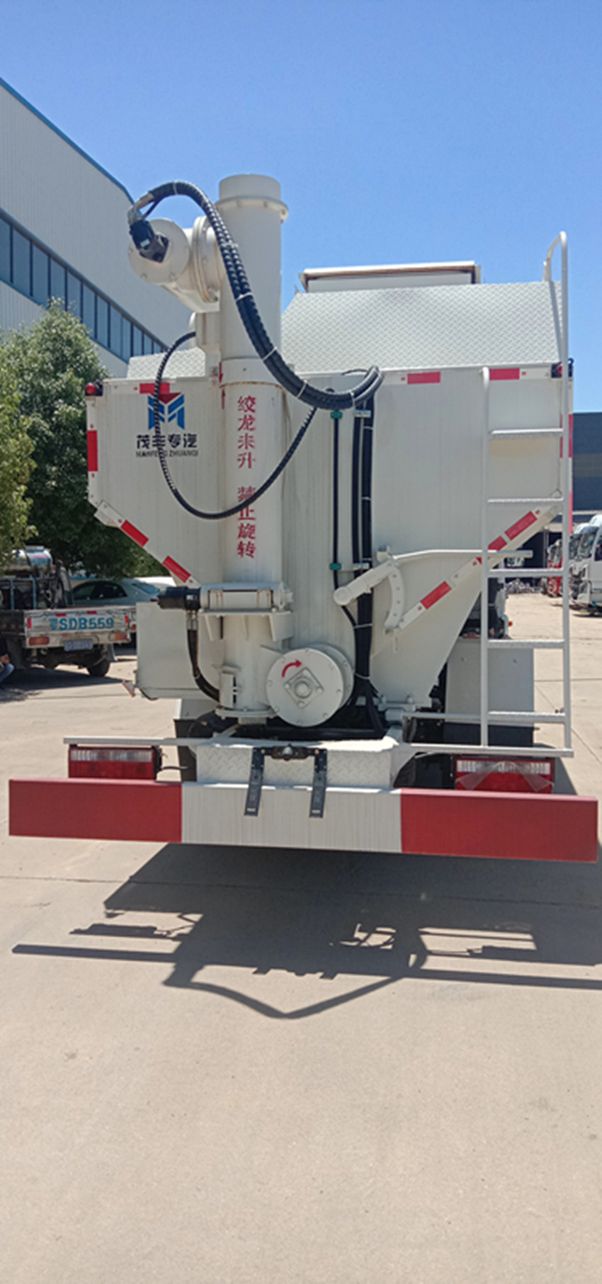 散裝飼料運輸車,散裝飼料車的飼料罐架設(shè)在卡車的底盤上,罐頂開有進料口.頂部的一根螺旋輸送卸料管(俗稱卸料絞龍)則可自由回轉(zhuǎn)和抬升,抬升的仰角可達60度。運輸時,頂部的螺旋管平臥在罐頂;卸料時則抬起,使管端的出料口與畜禽飼養(yǎng)場貯料罐頂部的進料門相接,駕駛室內(nèi)裝有操縱裝置(操縱裝置也可裝置在罐體尾部),卸料時通過車底的動力輸出軸和減速器來驅(qū)動螺旋,以完成卸料。
