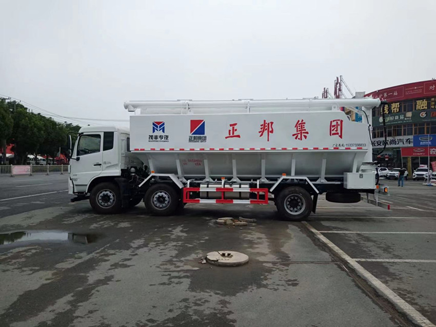散裝飼料運(yùn)輸車,散裝飼料車的飼料罐架設(shè)在卡車的底盤上,罐頂開有進(jìn)料口.頂部的一根螺旋輸送卸料管(俗稱卸料絞龍)則可自由回轉(zhuǎn)和抬升,抬升的仰角可達(dá)60度。運(yùn)輸時,頂部的螺旋管平臥在罐頂;卸料時則抬起,使管端的出料口與畜禽飼養(yǎng)場貯料罐頂部的進(jìn)料門相接,駕駛室內(nèi)裝有操縱裝置(操縱裝置也可裝置在罐體尾部),卸料時通過車底的動力輸出軸和減速器來驅(qū)動螺旋,以完成卸料。