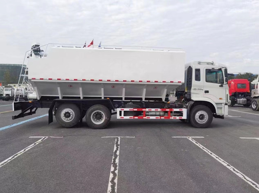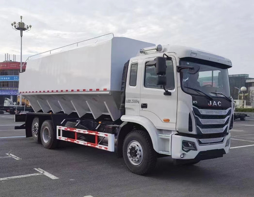 散裝飼料運輸車,散裝飼料車的飼料罐架設在卡車的底盤上,罐頂開有進料口.頂部的一根螺旋輸送卸料管(俗稱卸料絞龍)則可自由回轉和抬升,抬升的仰角可達60度。運輸時,頂部的螺旋管平臥在罐頂;卸料時則抬起,使管端的出料口與畜禽飼養(yǎng)場貯料罐頂部的進料門相接,駕駛室內(nèi)裝有操縱裝置(操縱裝置也可裝置在罐體尾部),卸料時通過車底的動力輸出軸和減速器來驅動螺旋,以完成卸料。