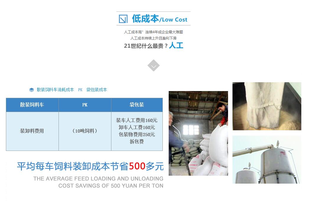 一個(gè)年產(chǎn)量為15萬噸的飼料廠,直銷:經(jīng)銷比例=3:7,直銷運(yùn)送范圍大約100-200公里。使用散裝車經(jīng)濟(jì)效益分析:年直銷量約:4.5萬噸。若以2萬噸可以使用散裝車運(yùn)送計(jì)算。2萬噸,按標(biāo)準(zhǔn)40KG/袋,共需50萬只編織袋,如果按每只編織袋成本0.8元,每年可節(jié)約袋子費(fèi)用40萬;再加上人工裝卸費(fèi)用約18元/噸,2萬噸可直接節(jié)約36萬元,去除使用散裝飼料車裝卸所需電耗2元/噸,一年4萬,合計(jì)72萬元。按照2萬噸運(yùn)輸量,平均每天運(yùn)輸約55噸,故3輛10噸飼料車(每輛每天運(yùn)輸2次),3輛飼料車(非整車)約60萬元,故不用一年便可收回成本。